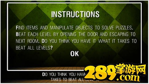 喜欢具有挑战性的任务吗?这个游戏很适合你!迷宫一般的密室,好多好多的门,100个房间?每道门都需要一个特别的方式来打开,需要你仔细观察周围的一切并巧妙的利用!这是一款逃脱冒险类游戏,游戏的目的很简单,您被关在某种特定的情况和特定的空间内,但只要打开房门,逃出即可!当然门是不会被轻易打开的,说不定还暗藏着很多您意想不到的阴谋诡计!但绝对不难,只要稍微注点意,就能找出所有关于脱逃的暗示,所以赶快来挑战脱逃吧!