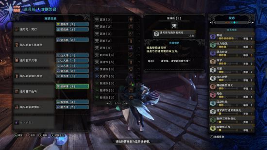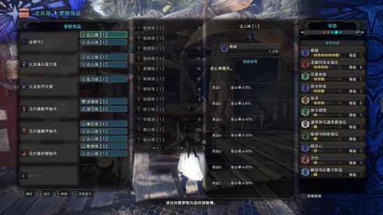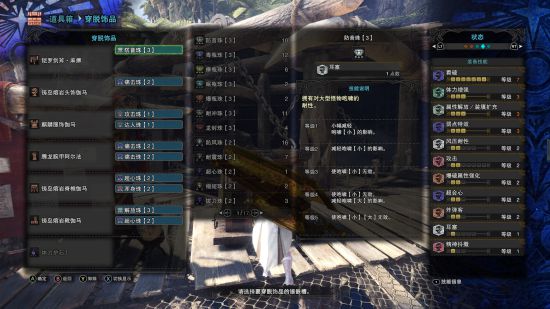 技能上看输出应该不高的一套配装,结果打团的时候却意外的好用。两分半之内历战咩最多能麻两次,撤掉一些珠子换麻痹珠或许还能更高效(笔者没有麻痹珠,是的,11颗达人,五颗攻击,大部分珠子都有的我一颗麻痹珠都没有!)仍有改良空间的配装,基本是打团定制配装。